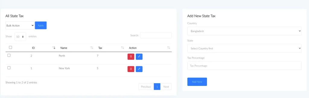How to set state tax Estimated reading: 1 minute 54 views With this script you can set tax based on country in percentage or a fixed amount, goto “Tax Settings > State Tax” select country and state then, set tax percentage.